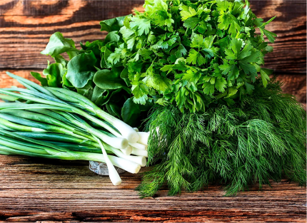 Зелень – это кладезь витаминов, минералов и аминокислот. Кроме того, только в зелени содержится хлорофилл (зелёный пигмент), который очень полезен для нашей крови и сосудов. Аминокислоты из зелени легко усваиваются организмом. Кроме того, она содержит полноценный растительный белок, необходимый лицам, ограничивающим в своём меню продукты животного происхождения.